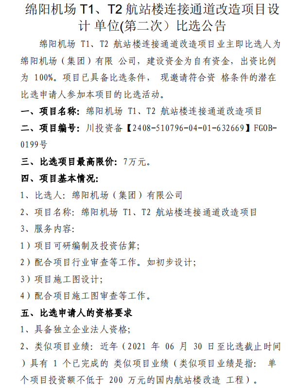 綿陽機(jī)場 T1、T2 航站樓連接通道改造項(xiàng)目設(shè)計單位(第二次)比選公告